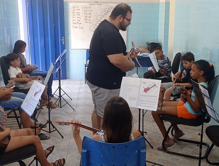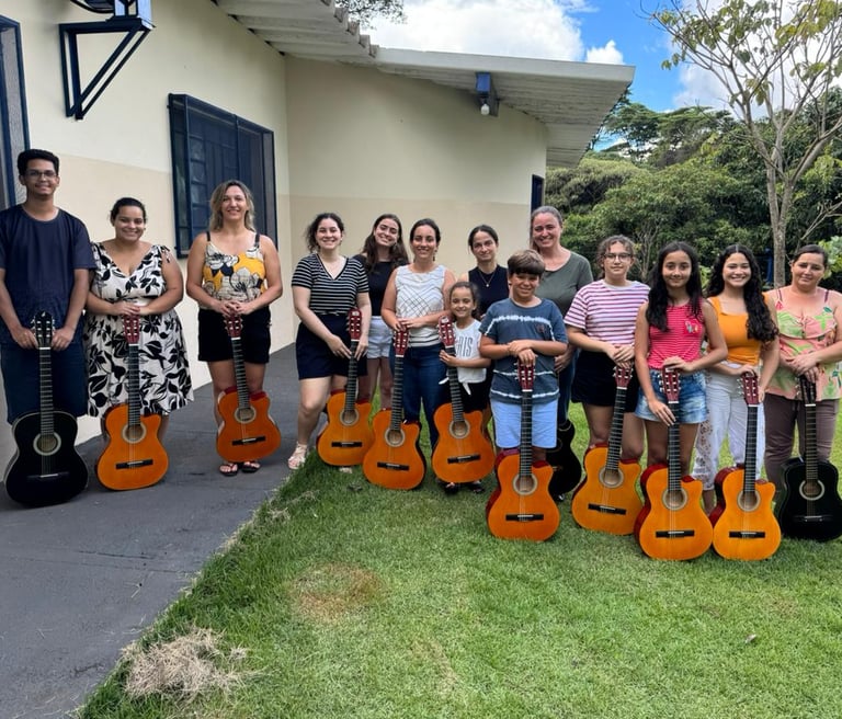 Atuamos com aulas de violão, viola caipira, ukulele, acordeon, fanfarra e canto coral, oferecendo oportunidades de aprendizado a crianças, jovens, adultos e idosos.